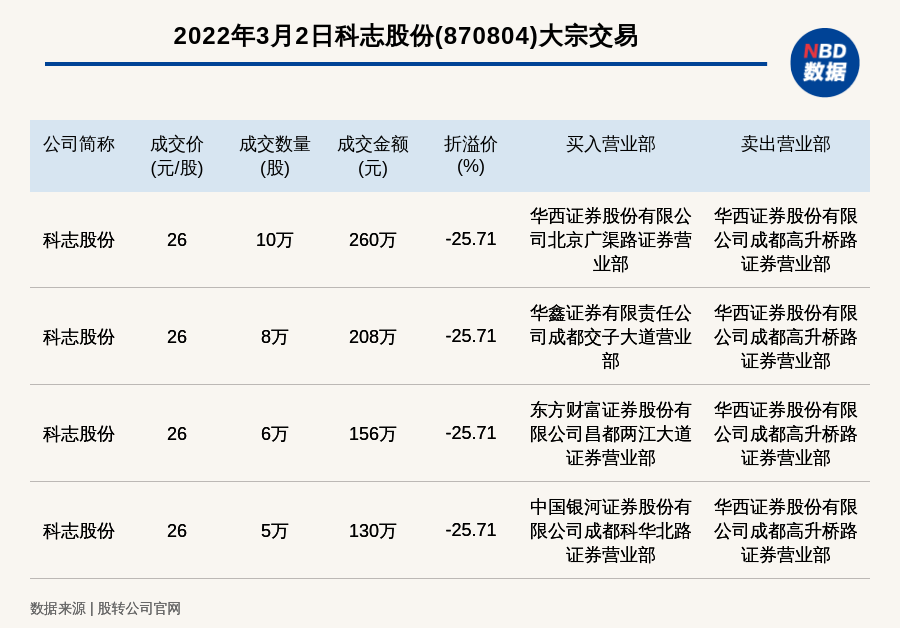 每经讯,2022年3月2日,新三板基础层公司科志股份(870804)发生4笔大宗交易,总成交金额为754万元,成交金额最高的一笔成交价26元/股,成交数量10万股,成交金额260万元,折价25.71%。买入营业部是华西证券股份有限公司北京广渠路证券营业部,卖出营业部是华西证券股份有限公司成都高升桥路证券营业部。