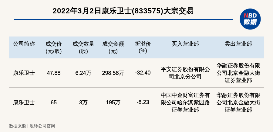 每经讯,2022年3月2日,新三板创新层公司康乐卫士(833575)发生2笔大宗交易,折价率最高的一笔成交价47.88元/股,成交数量6.24万股,成交金额298.58万元,折价32.4%。买入营业部是平安证券股份有限公司北京分公司,卖出营业部是华融证券股份有限公司北京金融大街证券营业部。