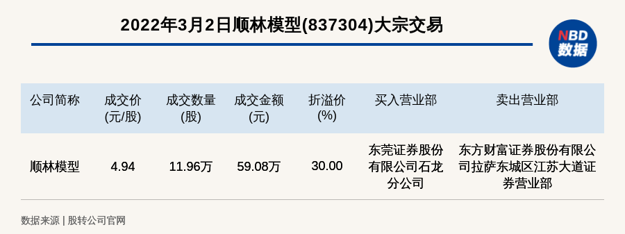 每经讯,2022年3月2日,新三板基础层公司顺林模型(837304)发生一笔大宗交易,成交价4.94元/股,成交数量11.96万股,成交金额59.08万元,溢价30%。买入营业部是东莞证券股份有限公司石龙分公司,卖出营业部是东方财富证券股份有限公司拉萨东城区江苏大道证券营业部。