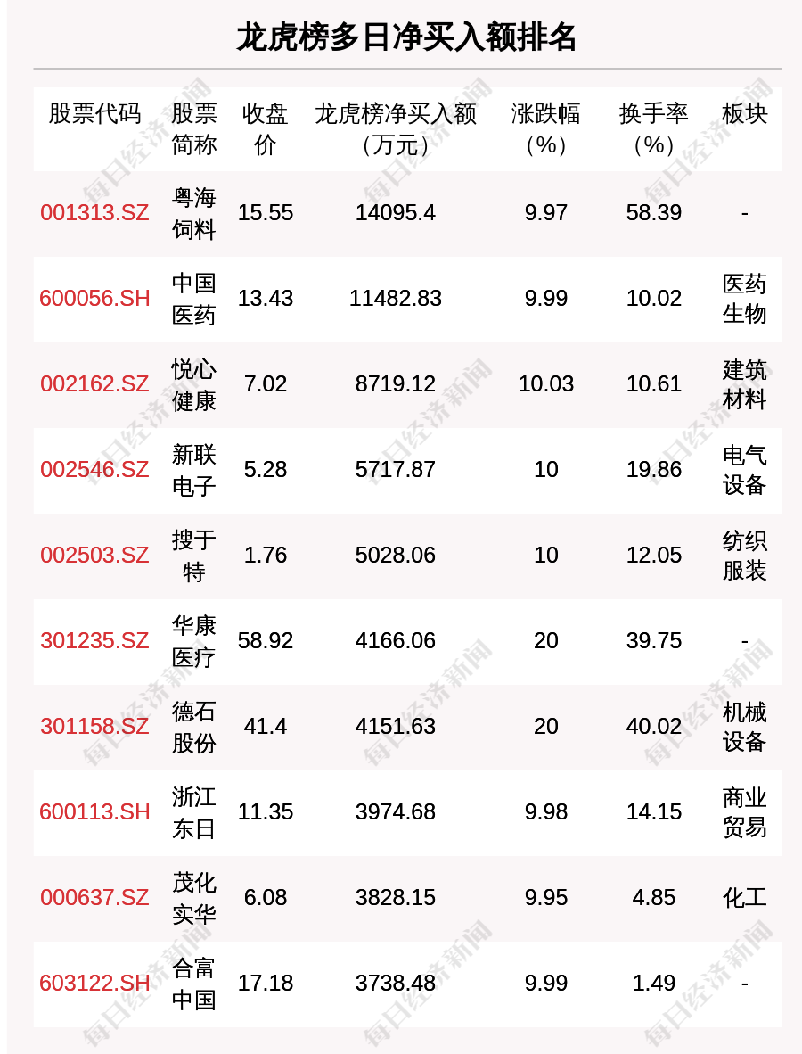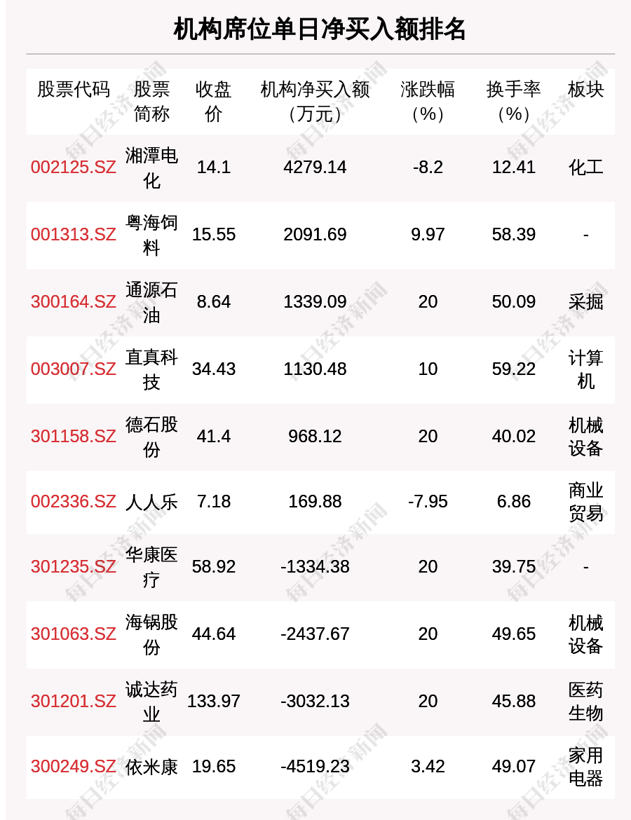在龙虎榜中,涉及机构专用席位的个股有16只,净买入额前三的是湘潭电化、粤海饲料、通源石油,分别为4279.14万元、2091.69万元、1339.09万元。