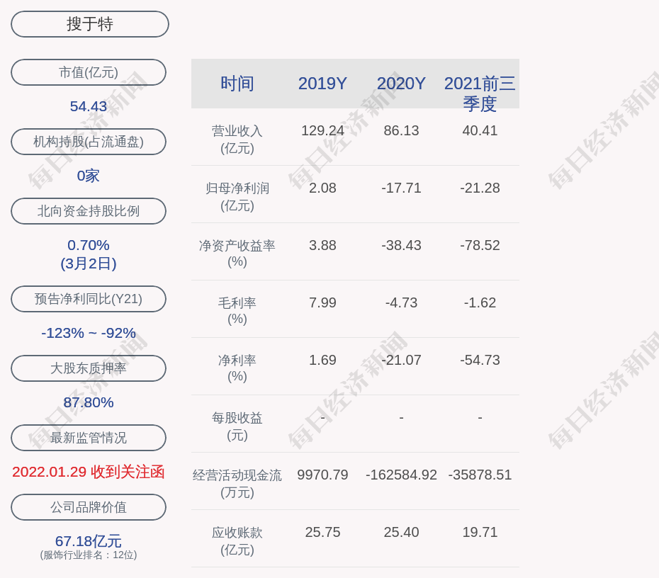 1. 搜于特近30日内北向资金持股量减少1563.64万股,占流通股比例减少0.61%;