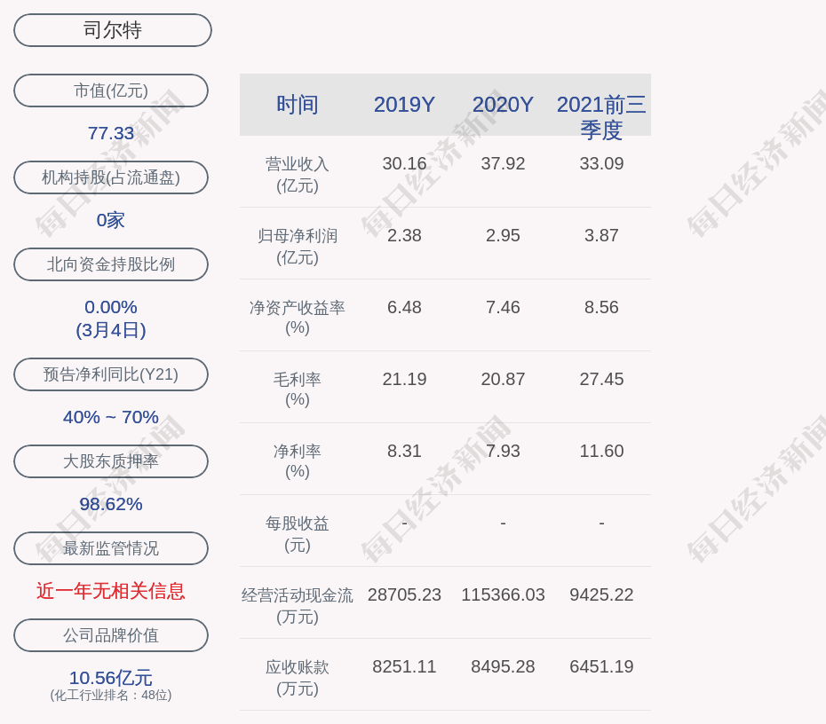 1. 司尔特近30日内北向资金持股量未发生变化;