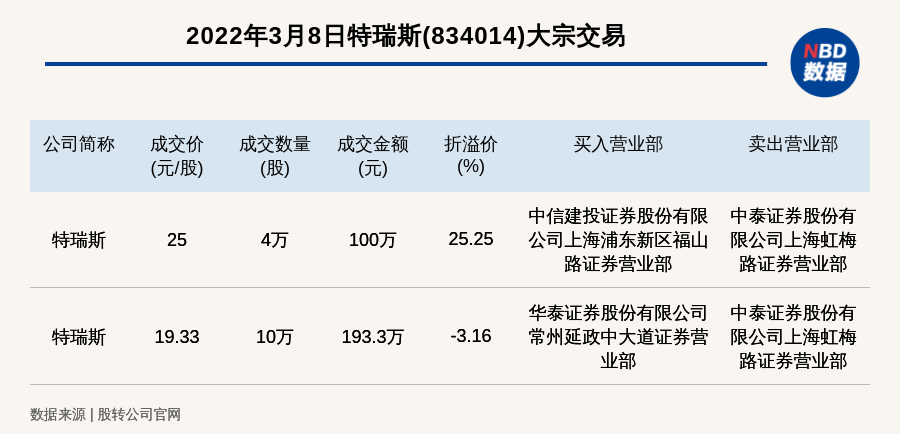 每经讯,2022年3月8日,新三板创新层公司特瑞斯(834014)发生2笔大宗交易,溢价率最高的一笔成交价25元/股,成交数量4万股,成交金额100万元,溢价25.25%。买入营业部是中信建投证券股份有限公司上海浦东新区福山路证券营业部,卖出营业部是中泰证券股份有限公司上海虹梅路证券营业部。