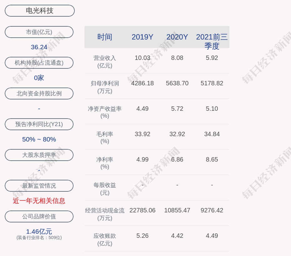 每经AI快讯,电光科技(SZ 002730,收盘价:10.01元)3月8日晚间发布2021年度业绩快报,营业收入约9.19亿元,同比增加13.75%;归属于上市公司股东的净利润盈利约9098万元,同比增加61.34%;基本每股收益盈利0.28元,同比增加61.34%。报告期内公司营业总收入增长,营业利润约9862万元,同比增长51.53%,归属于上市公司股东的净利润增长。报告期内,公司主营防爆电器业务稳定增长,应收账款回笼加快,电力专用设备制造业务相比去年增长明显。公司剥离教育资产后,商誉归零,商誉减值和资产减值减少。智慧矿山业务和特殊领域防爆业务开始逐步释放业绩。