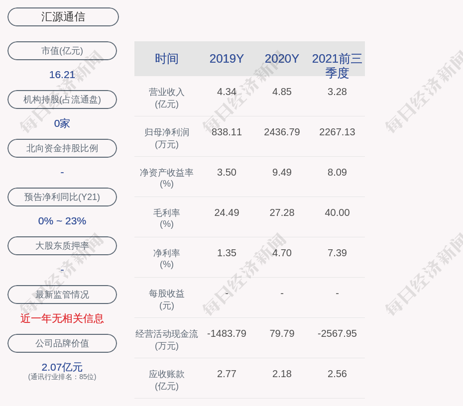 每经AI快讯,汇源通信(SZ 000586,收盘价:8.38元)3月8日晚间发布年度业绩报告称,2021年营业收入约4.5亿元,同比减少7.31%;归属于上市公司股东的净利润盈利约2614万元,同比增加7.28%;基本每股收益盈利0.1351元,同比增加7.22%。分配方案为:不分红、不送红股、不转增。