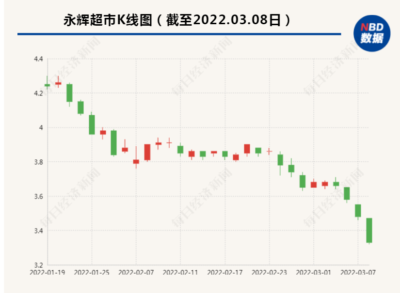 盘面上,截止今日(8日)收盘,永辉超市股价下跌4.31%,报3.33元/股,总市值达302.2亿元。