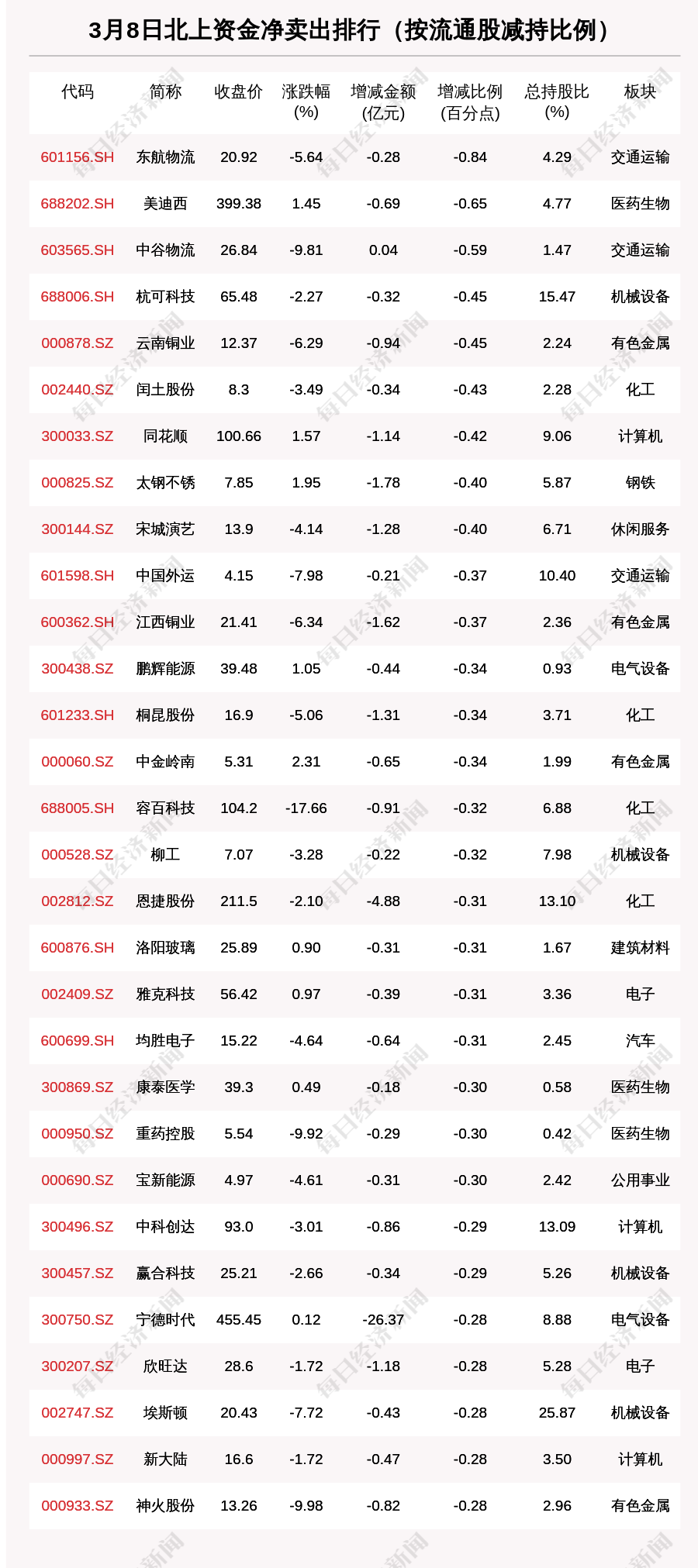 每经AI快讯,3月8日,北上资金净卖出的个股共有814只,北上资金减仓比例超1%的有698只。其中,东航物流(601156.SH,收盘价:20.92元)减仓比例最为明显,最新持股比例4.29%,环比减少0.84个百分点。其他北上资金减仓比例较多的个股还包括美迪西(688202.SH,收盘价:399.38元)、中谷物流(603565.SH,收盘价:26.84元)、杭可科技(688006.SH,收盘价:65.48元)。