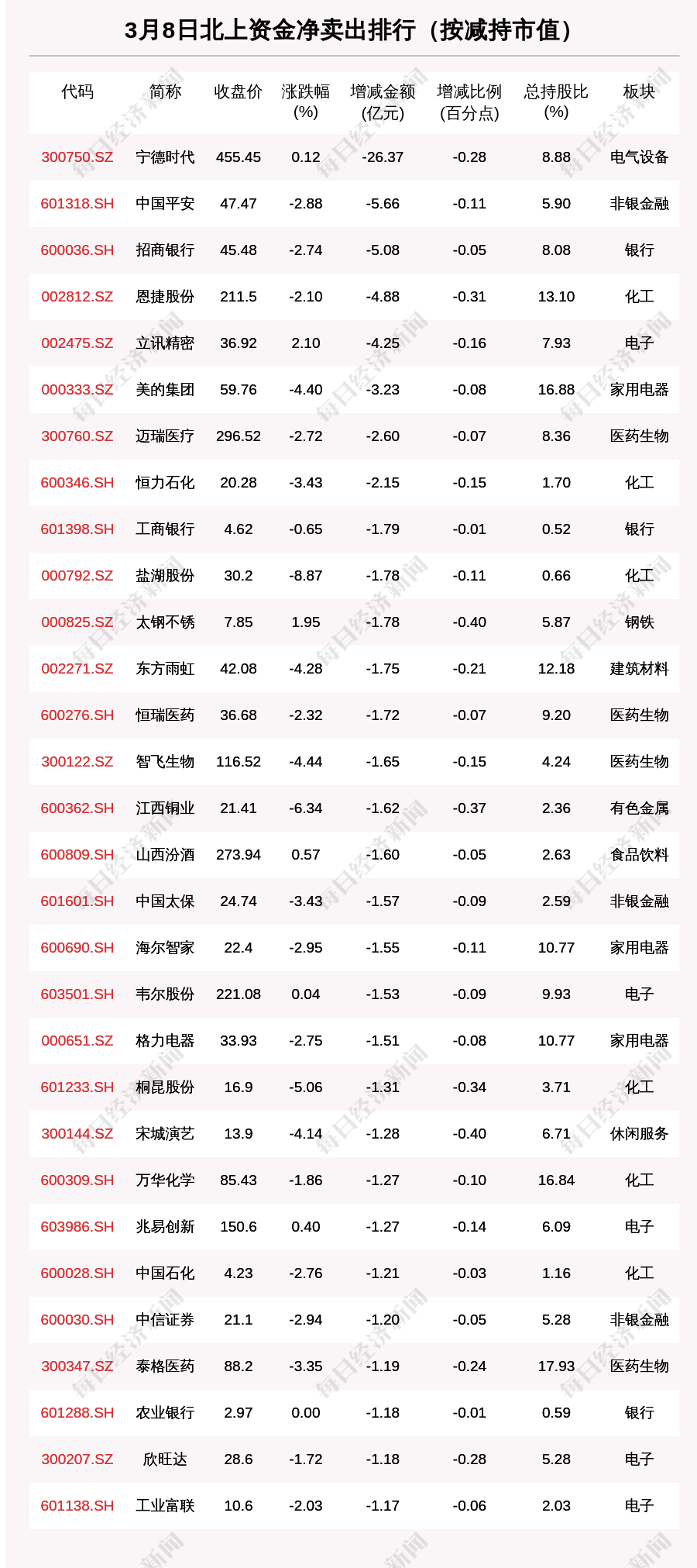 3月8日,按照北向资金减持市值排序,宁德时代(300750.SZ,收盘价:455.45元)减持市值最大,减持市值26.368亿元,环比减少3.10%。其他北上资金减持市值较多的个股还包括中国平安(601318.SH,收盘价:47.47元)、招商银行(600036.SH,收盘价:45.48元)、恩捷股份(002812.SZ,收盘价:211.5元)。