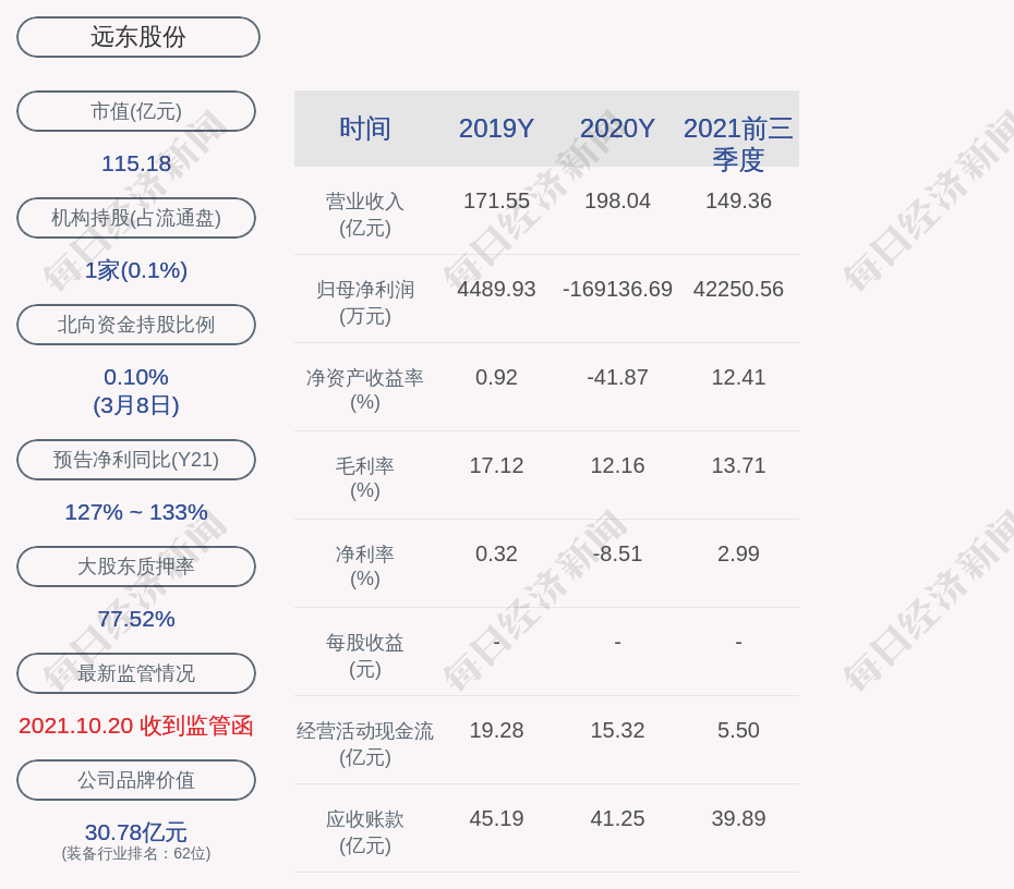 每经AI快讯,远东股份(SH 600869,收盘价:5.19元)3月9日晚间发布公告称,截至目前,公司对外担保总额约为85.7亿元,实际担保余额约为54.16亿元,分别占公司2020年经审计归属于上市公司股东的净资产的比例为269.38%、170.24%,其中:公司对全资/控股子公司的担保总额约为81.7亿元,实际担保余额约为50.7亿元,分别占公司2020年经审计归属于上市公司股东的净资产的256.81%、159.37%;公司对其他公司的担保总额为4亿元,实际担保余额为3.46亿元,分别占公司2020年经审计归属于上市公司股东的净资产的12.57%、10.88%,公司对外担保均不存在逾期情形。
