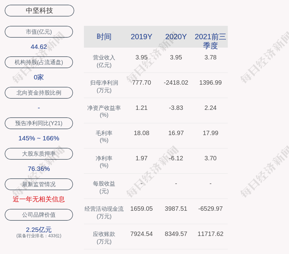 每经AI快讯,中坚科技(SZ 002779,收盘价:33.8元)3月9日晚间发布公告称,中坚机电质押1420万股。截至本公告日,中坚机电累计质押股数为6616万股,占其所持股份比例为97.23%。