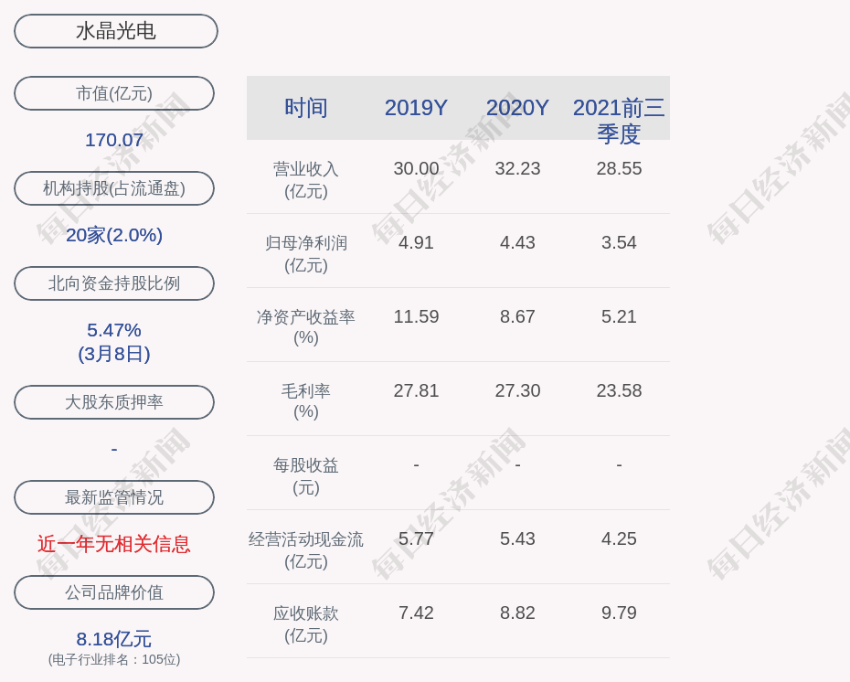 1. 水晶光电近30日内北向资金持股量增加3412.26万股,占流通股比例增加2.21%;