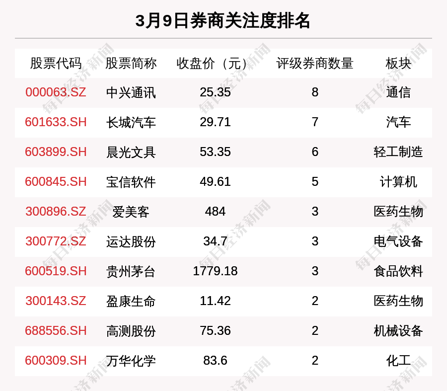 从券商对个股的关注程度来看,有14只个股获得多家券商关注,券商关注数量排名居前的个股是中兴通讯(000063.SZ)、长城汽车(601633.SH)、晨光文具(603899.SH)。