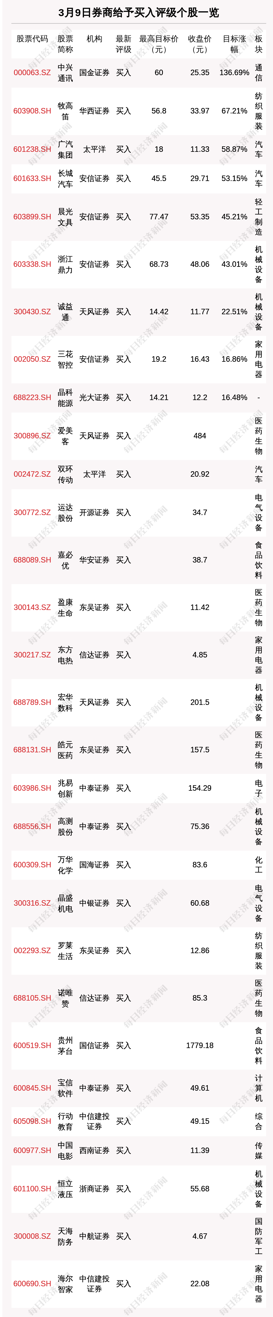 每经AI快讯,3月9日,券商给予评级的个股数共有44只,获得买入评级的个股数共有30只。在公布了目标价格的9只个股中,按照最新收盘价计算,预期涨幅排名居前的个股是中兴通讯(000063.SZ)、牧高笛(603908.SH)、广汽集团(601238.SH),预期涨幅分别是136.69%、67.21%、58.87%。