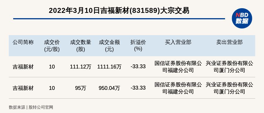 每经讯,2022年3月10日,新三板基础层公司吉福新材(831589)发生2笔大宗交易,总成交金额为2061.2万元,成交金额最高的一笔成交价10元/股,成交数量111.12万股,成交金额1111.16万元,折价33.33%。买入营业部是国信证券股份有限公司福建分公司,卖出营业部是兴业证券股份有限公司厦门分公司。