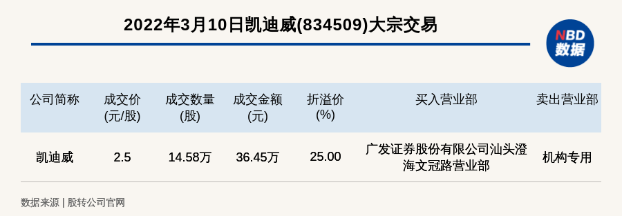每经讯,2022年3月10日,新三板基础层公司凯迪威(834509)发生一笔大宗交易,成交价2.5元/股,成交数量14.58万股,成交金额36.45万元,溢价25%。买入营业部是广发证券股份有限公司汕头澄海文冠路营业部,卖出营业部是机构专用。