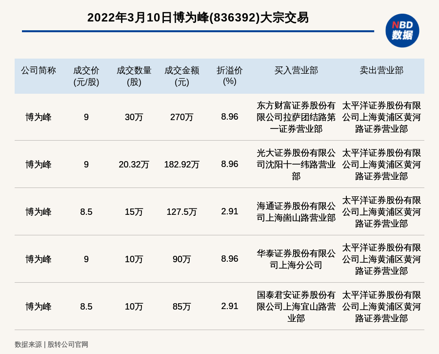 每经讯,2022年3月10日,新三板创新层公司博为峰(836392)发生5笔大宗交易,总成交金额为755.42万元,成交金额最高的一笔成交价9元/股,成交数量30万股,成交金额270万元,溢价8.96%。买入营业部是东方财富证券股份有限公司拉萨团结路第一证券营业部,卖出营业部是太平洋证券股份有限公司上海黄浦区黄河路证券营业部。