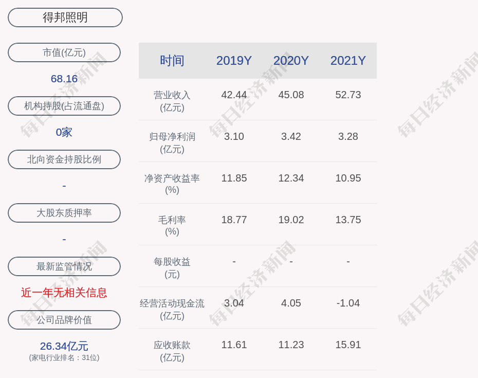 每经AI快讯,得邦照明(SH 603303,收盘价:14.29元)3月10日晚间发布年度业绩报告称,2021年营业收入约52.73亿元,同比增加16.98%;归属于上市公司股东的净利润盈利约3.28亿元,同比减少4.19%;基本每股收益盈利0.6871元,同比减少4.19%。
