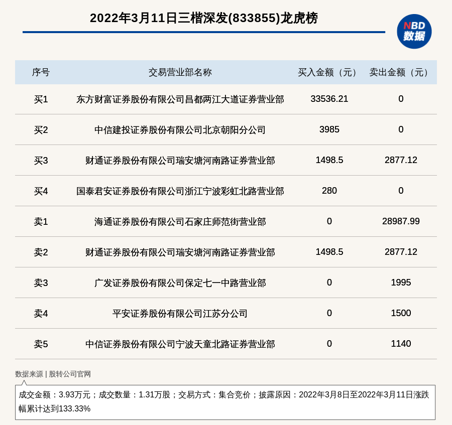 每经讯,2022年3月11日,新三板创新层公司三楷深发(833855)登上龙虎榜,交易方式是集合竞价,披露原因是2022年3月8日至2022年3月11日涨跌幅累计达到133.33%,成交数量1.31万股,成交金额3.93万元。买一席位为东方财富证券股份有限公司昌都两江大道证券营业部,买入3.35万元;卖一席位为海通证券股份有限公司石家庄师范街营业部,卖出2.9万元。