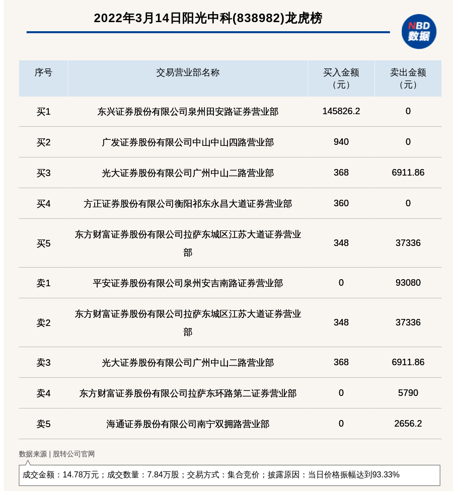 每经讯,2022年3月14日,新三板创新层公司阳光中科(838982)登上龙虎榜,交易方式是集合竞价,披露原因是当日价格振幅达到93.33%,成交数量7.84万股,成交金额14.78万元。买一席位为东兴证券股份有限公司泉州田安路证券营业部,买入14.58万元;卖一席位为平安证券股份有限公司泉州安吉南路证券营业部,卖出9.31万元。