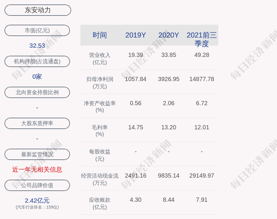每经AI快讯,东安动力(SH 600178,收盘价:7.04元)3月14日晚间发布年度业绩报告称,2021年营业收入约65.86亿元,同比增加22.35%;归属于上市公司股东的净利润盈利约9068万元,同比增加104.8%;基本每股收益盈利0.1962元,同比增加104.8%。分配方案为:不送红股、不转增。