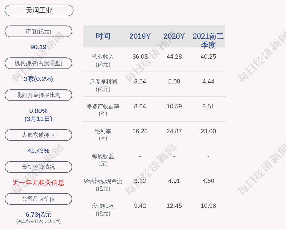 每经AI快讯,天润工业(SZ 002283,收盘价:7.94元)3月14日晚间发布年度业绩报告称,2021年营业收入约47.21亿元,同比增加6.6%;归属于上市公司股东的净利润盈利约5.41亿元,同比增加6.57%;基本每股收益盈利0.49元,同比增加8.89%。分配方案为:每10股派发现金红利1元(含税)、不送红股、不转增。