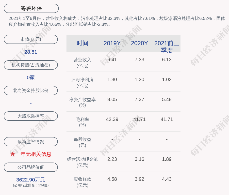2021年1至6月份,海峡环保的营业收入构成为:污水处理占比82.3%,其他占比7.61%,垃圾渗沥液处理占比6.52%,固体废弃物处置收入占比4.66%,分部间抵销占比-2.3%。