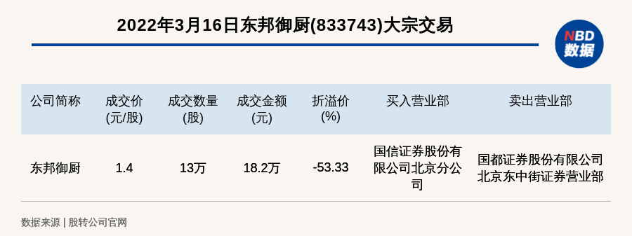 每经讯,2022年3月16日,新三板创新层公司东邦御厨(833743)发生一笔大宗交易,成交价1.4元/股,成交数量13万股,成交金额18.2万元,折价53.33%。买入营业部是国信证券股份有限公司北京分公司,卖出营业部是国都证券股份有限公司北京东中街证券营业部。