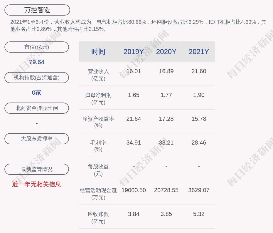 2021年1至6月份,万控智造的营业收入构成为:电气机柜占比80.66%,环网柜设备占比6.29%,IE/IT机柜占比4.69%,其他业务占比2.89%,其他附件占比2.15%。
