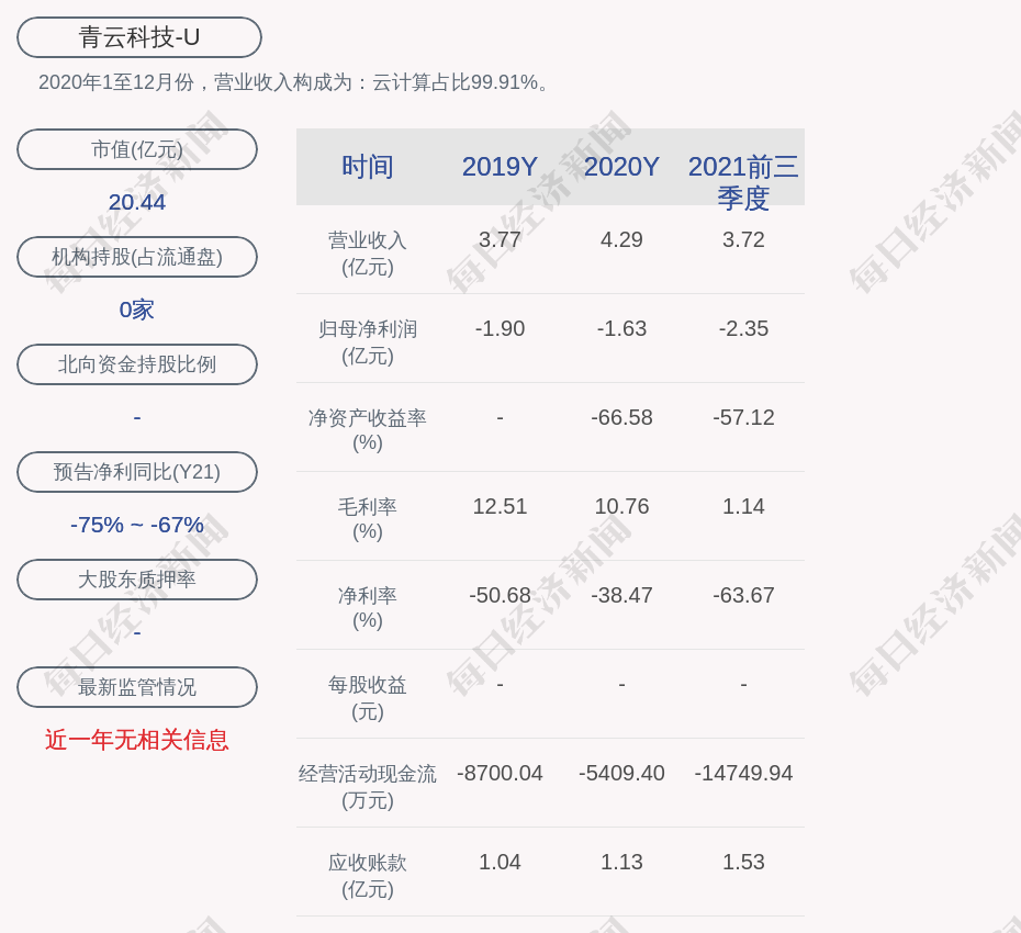 2020年1至12月份,青云科技的营业收入构成为:云计算占比99.91%。