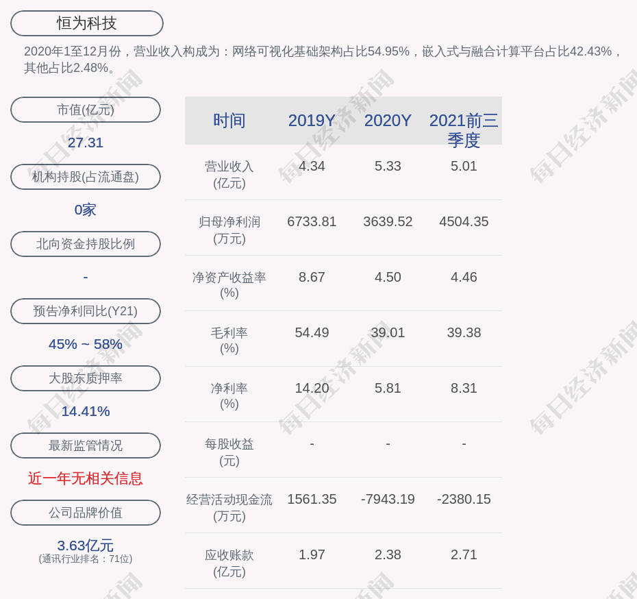 2020年1至12月份,恒为科技的营业收入构成为:网络可视化基础架构占比54.95%,嵌入式与融合计算平台占比42.43%,其他占比2.48%。