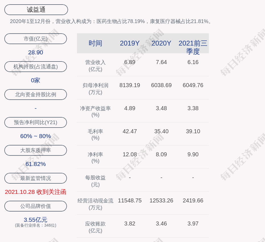 2020年1至12月份,诚益通的营业收入构成为:医药生物占比78.19%,康复医疗器械占比21.81%。