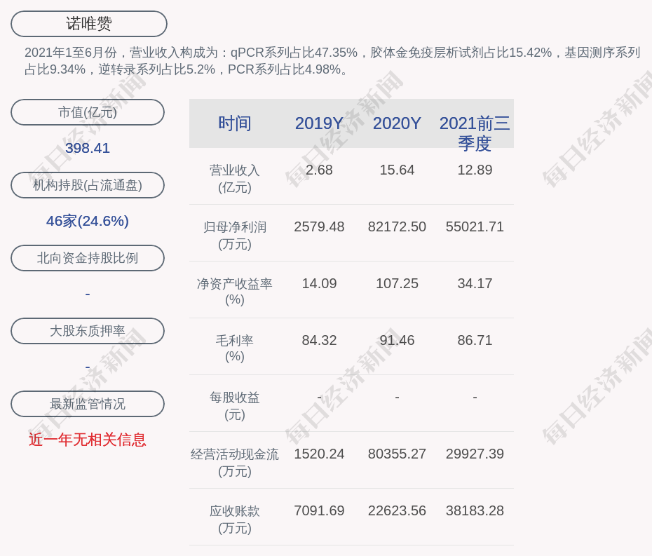 2021年1至6月份,诺唯赞的营业收入构成为:qPCR系列占比47.35%,胶体金免疫层析试剂占比15.42%,基因测序系列占比9.34%,逆转录系列占比5.2%,PCR系列占比4.98%。