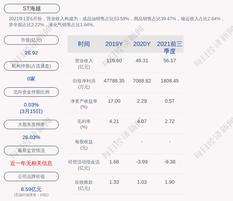2021年1至6月份,ST海越的营业收入构成为:成品油销售占比53.59%,商品销售占比39.47%,储运收入占比2.64%,异辛烷占比2.22%,液化气销售占比1.64%。