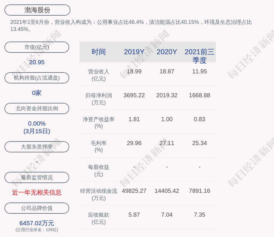 2021年1至6月份,渤海股份的营业收入构成为:公用事业占比46.4%,清洁能源占比40.15%,环境及生态治理占比13.45%。