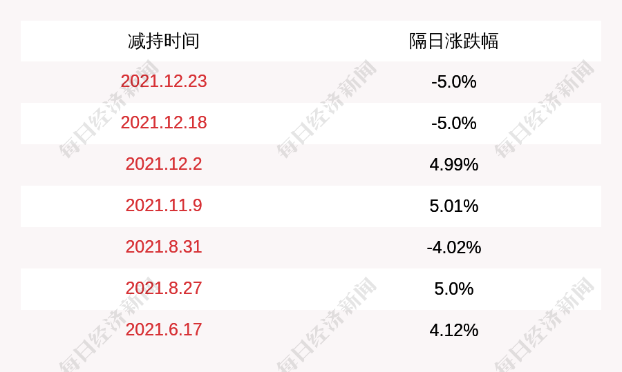 2. *ST德新上次发布减持公告是2021年12月23日,第二个交易日下跌5.0%,*ST德新近一年共发布8次减持类公告。