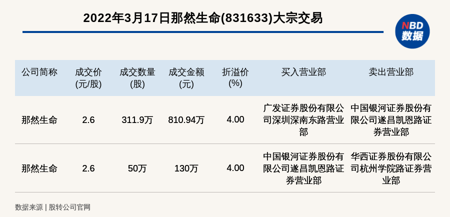 每经讯,2022年3月17日,新三板创新层公司那然生命(831633)发生2笔大宗交易,总成交金额为940.94万元,成交金额最高的一笔成交价2.6元/股,成交数量311.9万股,成交金额810.94万元,溢价4%。买入营业部是广发证券股份有限公司深圳深南东路营业部,卖出营业部是中国银河证券股份有限公司遂昌凯恩路证券营业部。