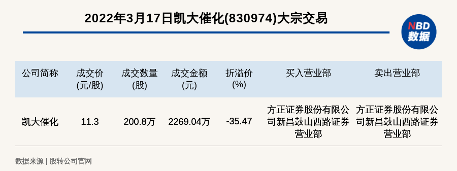 每经讯,2022年3月17日,新三板创新层公司凯大催化(830974)发生一笔大宗交易,成交价11.3元/股,成交数量200.8万股,成交金额2269.04万元,折价35.47%。买入营业部是方正证券股份有限公司新昌鼓山西路证券营业部,卖出营业部是方正证券股份有限公司新昌鼓山西路证券营业部。