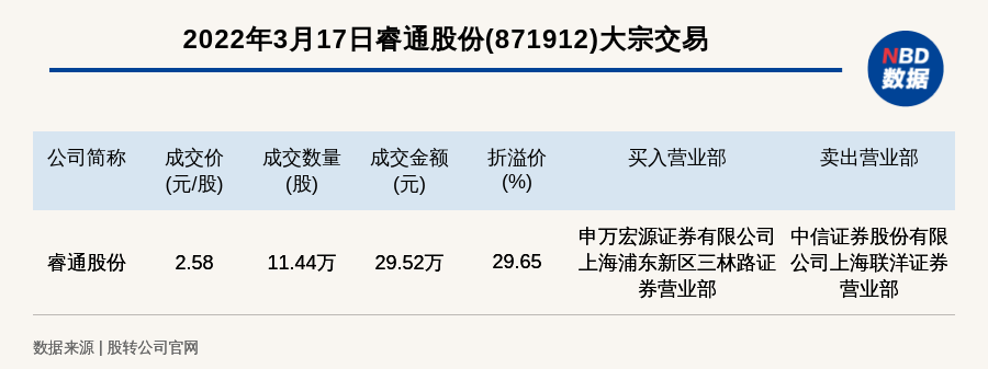 每经讯,2022年3月17日,新三板基础层公司睿通股份(871912)发生一笔大宗交易,成交价2.58元/股,成交数量11.44万股,成交金额29.52万元,溢价29.65%。买入营业部是申万宏源证券有限公司上海浦东新区三林路证券营业部,卖出营业部是中信证券股份有限公司上海联洋证券营业部。