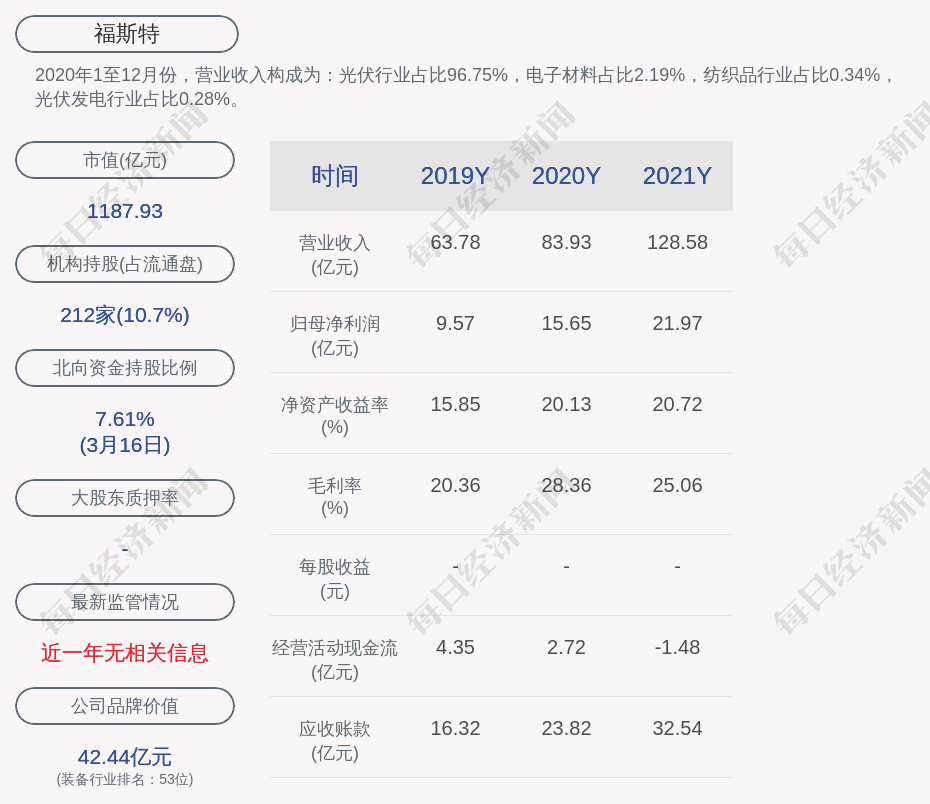 每经AI快讯,福斯特(SH 603806,收盘价:124.9元)3月17日晚间发布年度业绩报告称,2021年营业收入约128.58亿元,同比增加53.2%;归属于上市公司股东的净利润盈利约21.97亿元,同比增加40.35%;基本每股收益盈利2.35元,同比增加35.06%。