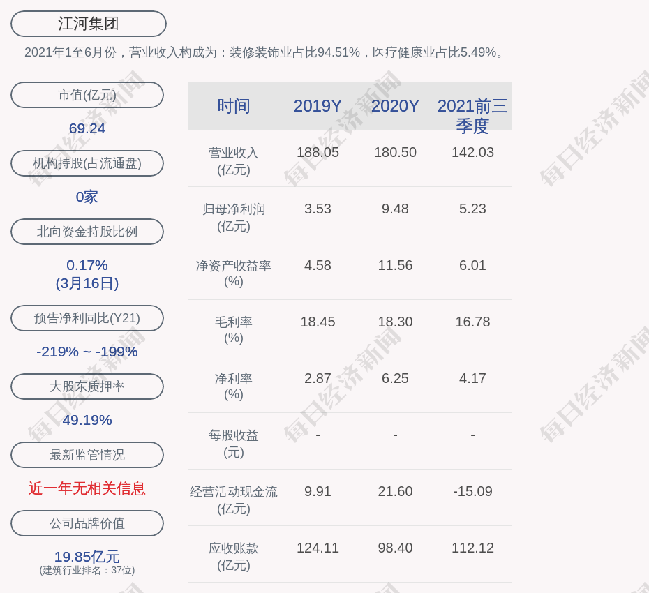2021年1至6月份,江河集团的营业收入构成为:装修装饰业占比94.51%,医疗健康业占比5.49%。