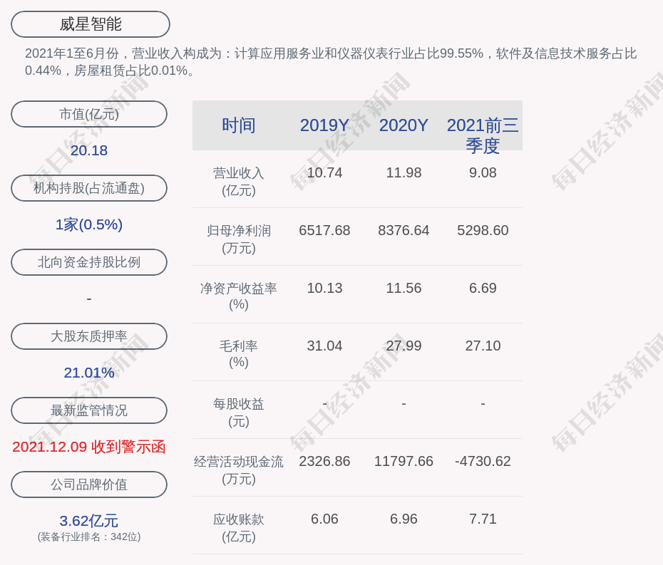 2021年1至6月份,威星智能的营业收入构成为:计算应用服务业和仪器仪表行业占比99.55%,软件及信息技术服务占比0.44%,房屋租赁占比0.01%。