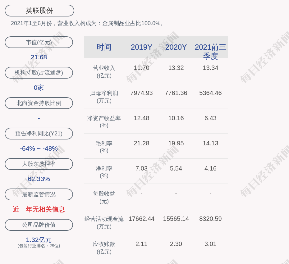 2021年1至6月份,英联股份的营业收入构成为:金属制品业占比100.0%。