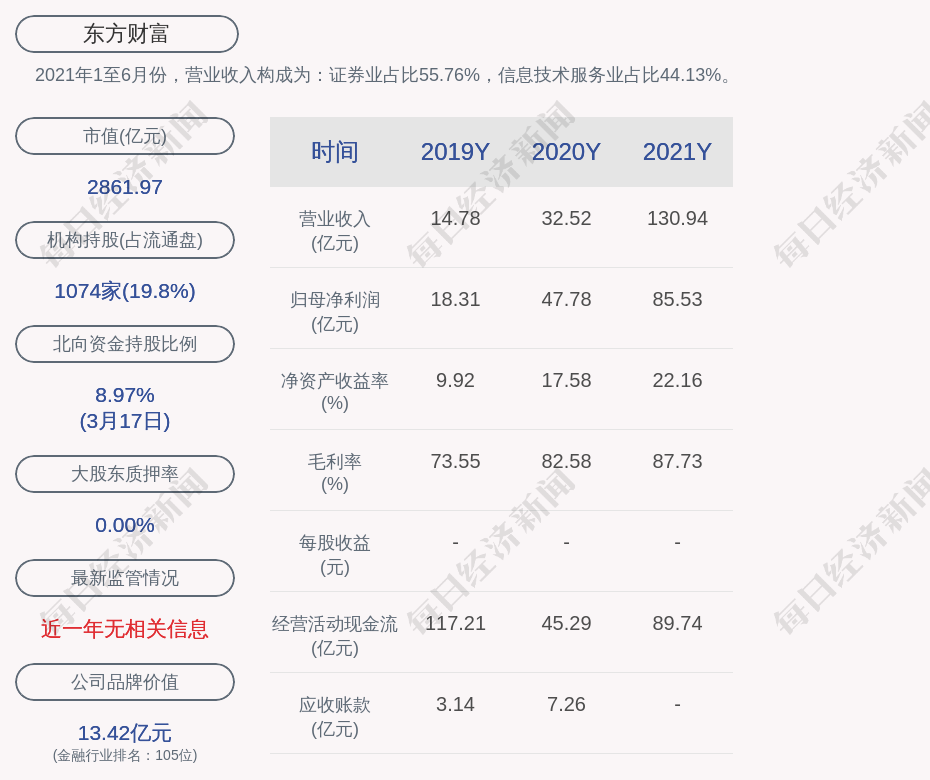 2021年1至6月份,东方财富的营业收入构成为:证券业占比55.76%,信息技术服务业占比44.13%。