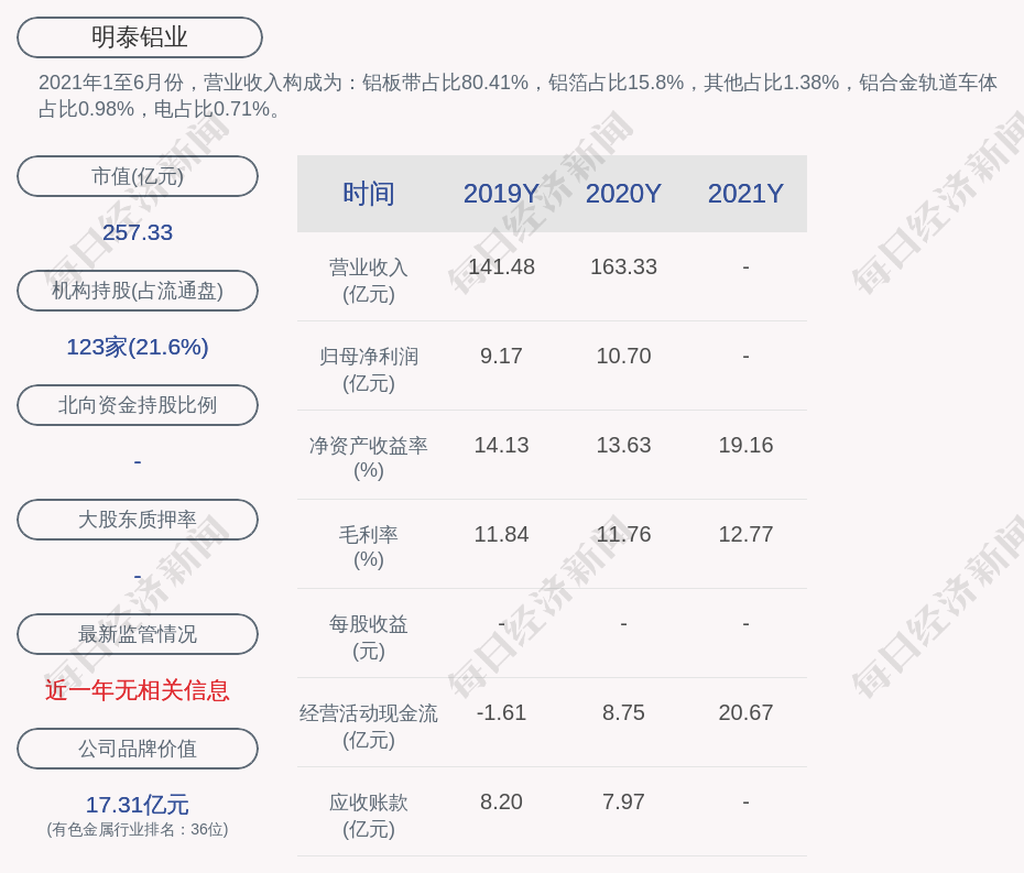 2021年1至6月份,明泰铝业的营业收入构成为:铝板带占比80.41%,铝箔占比15.8%,其他占比1.38%,铝合金轨道车体占比0.98%,电占比0.71%。