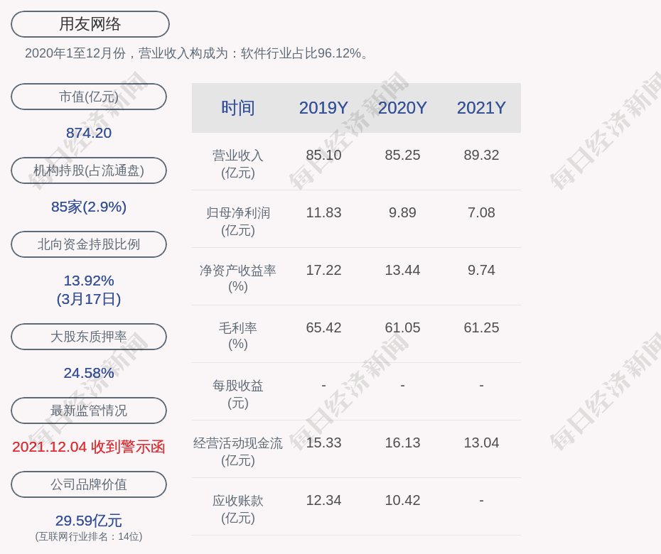 每经AI快讯,用友网络(SH 600588,收盘价:25.44元)3月18日晚间发布年度业绩报告称,2021年营业收入约89.32亿元,同比增加4.7%;归属于上市公司股东的净利润盈利约7.08亿元,同比减少28.2%;基本每股收益盈利0.22元,同比减少26.7%。
