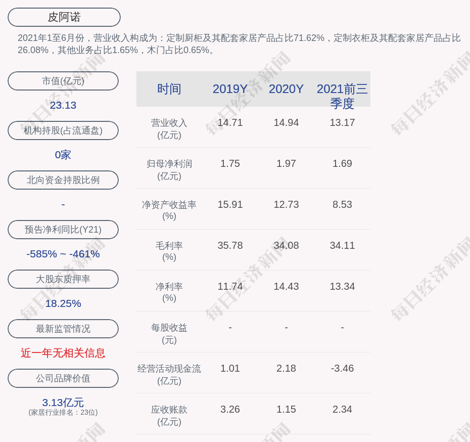2021年1至6月份,皮阿诺的营业收入构成为:定制厨柜及其配套家居产品占比71.62%,定制衣柜及其配套家居产品占比26.08%,其他业务占比1.65%,木门占比0.65%。