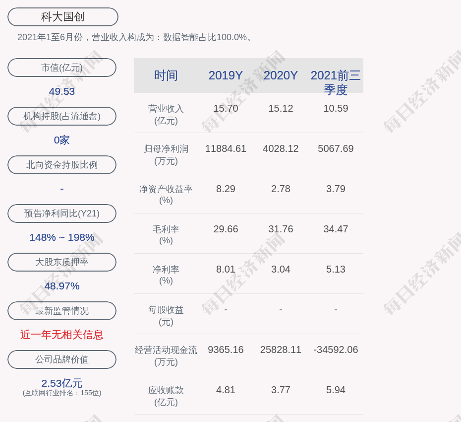 2021年1至6月份,科大国创的营业收入构成为:数据智能占比100.0%。