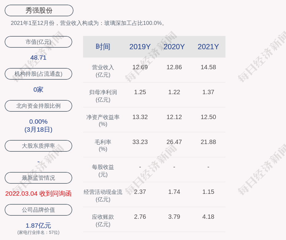 2021年1至12月份,秀强股份的营业收入构成为:玻璃深加工占比100.0%。