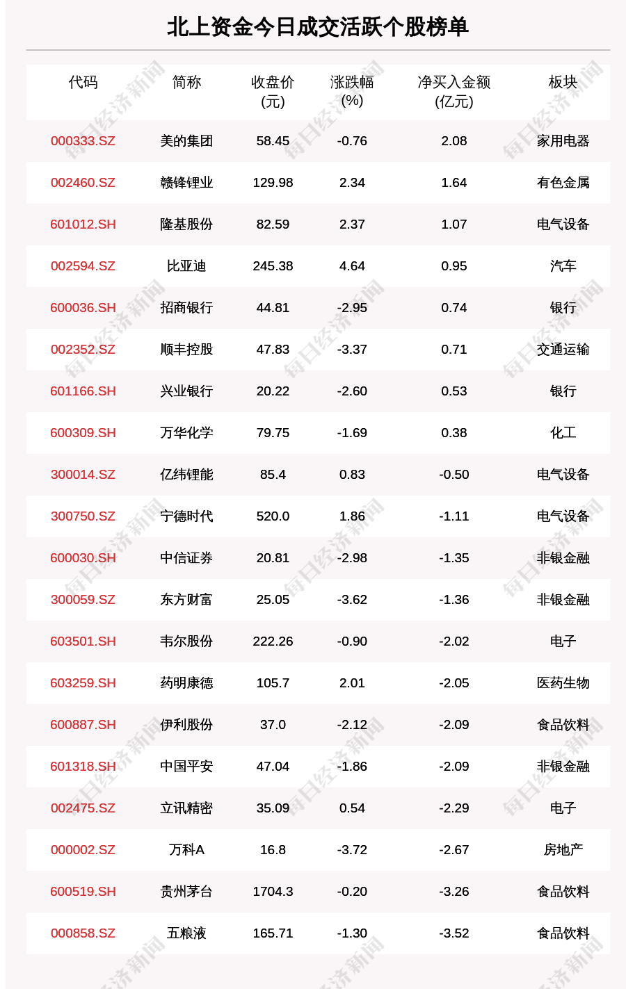 3月21日,北上资金成交活跃个股榜单中,净买入个股共8只,金额最多的是美的集团(000333.SZ,收盘价:58.45元),净买入2.077亿元;净卖出个股共12只,金额最多的是五粮液(000858.SZ,收盘价:165.71元),净卖出3.524亿元。