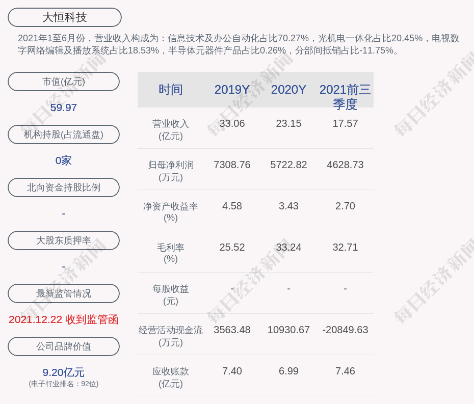 2021年1至6月份,大恒科技的营业收入构成为:信息技术及办公自动化占比70.27%,光机电一体化占比20.45%,电视数字网络编辑及播放系统占比18.53%,半导体元器件产品占比0.26%,分部间抵销占比-11.75%。